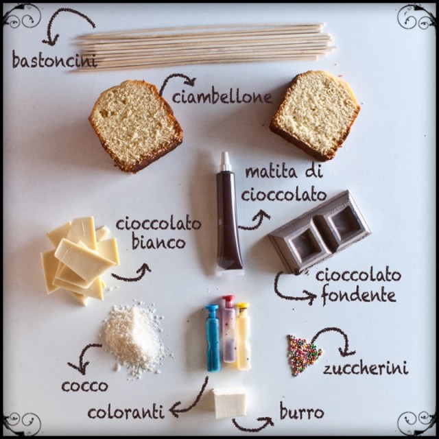 – coloranti per dolci e decorazioni varie (farina di cocco, nocciole tritate, granella di pistacchi, zuccherini colorati, matite di cioccolato…..).