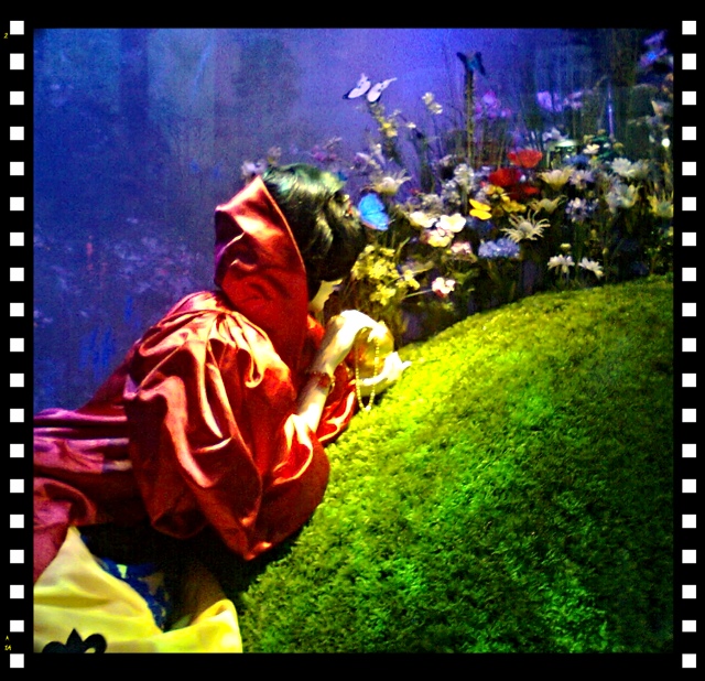 Ci sono luci e mille colori e le fiabe, che sono protagoniste, si presentano a misura d’uomo. Per citarne alcune: Biancaneve e lo Specchio Magico che mi si avvicina tenebroso, rivelandomi non solo di non essere più la più bella del Reame, ma anche che Biancaneve, appunto, è ultimamente in charge del titolo; Cenerentola e la sua carrozza trainata da cavalli bianchi in corsa verso il castello per il Gran Ballo (tutti bellissimi esemplari, peccato che poi tornino topolini), la Bella addormentata che sbadiglia, il Principe Ranocchio e la Principessa prima del bacio, Raperonzolo con la sua lunghissima treccia bionda che ancora attende pazientemente di essere liberata, Peter Pan che svolazza qua e là pur di non crescere mai, Pocahontas la principessa selvaggia e altri personaggi popolano le vetrine del palazzo contornato di luci bianche a Knightsbridge.
